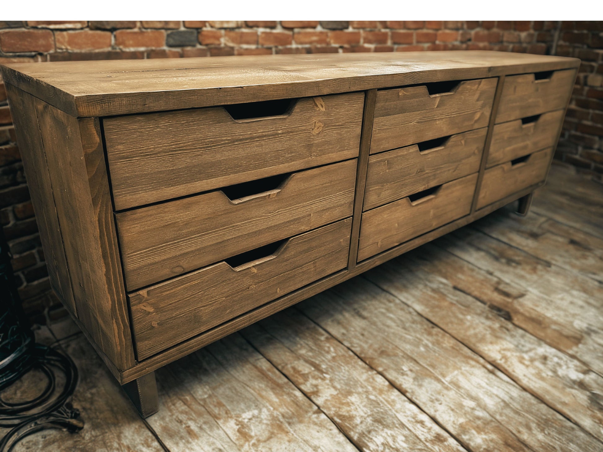 The Grunnek Chest of Drawers combines modern craftsmanship with solid wood warmth. Pictured here in a rich Walnut finish, the 200 cm version features nine spacious drawers set on sleek black metal rail legs — a bold, contemporary twist on timeless design.
